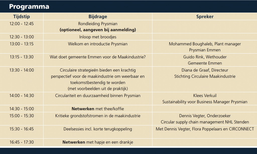 Door ervaringen en ideeën te delen, bouwen we samen aan een sterkere, innovatievere en meer circulaire maakindustrie in Emmen. Ook de maakindustrie uit de regio wordt uitgenodigd, de markt houdt immers niet op in Emmen. Wethouder Guido Rink zal het programma openen. Diana de Graaf, Directeur Stichting Circulaire Maakindustrie vertelt wat de maakindustrie al doet en waar kansen liggen en hoe de stichting kan ondersteunen, Dennis Vegter van NHL Stenden neemt ons mee in supply chain management en kritische grondstofstromen.