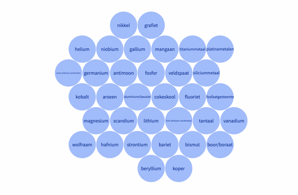 Momenteel staan er 34 grondstoffen op de lijst van kritieke grondstoffen, deze lijst wordt elke drie jaar geactualiseerd door de Europese Commissie.